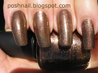 So let us start with OPI Warm & Fozzie, a brown foil with very fine coppery green glitter. I love this nail polish and it suits my skin tone perfectly. I don't like brown coloured nail polish or clothes so I did not expect to like it as much as I do.